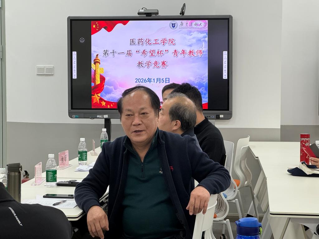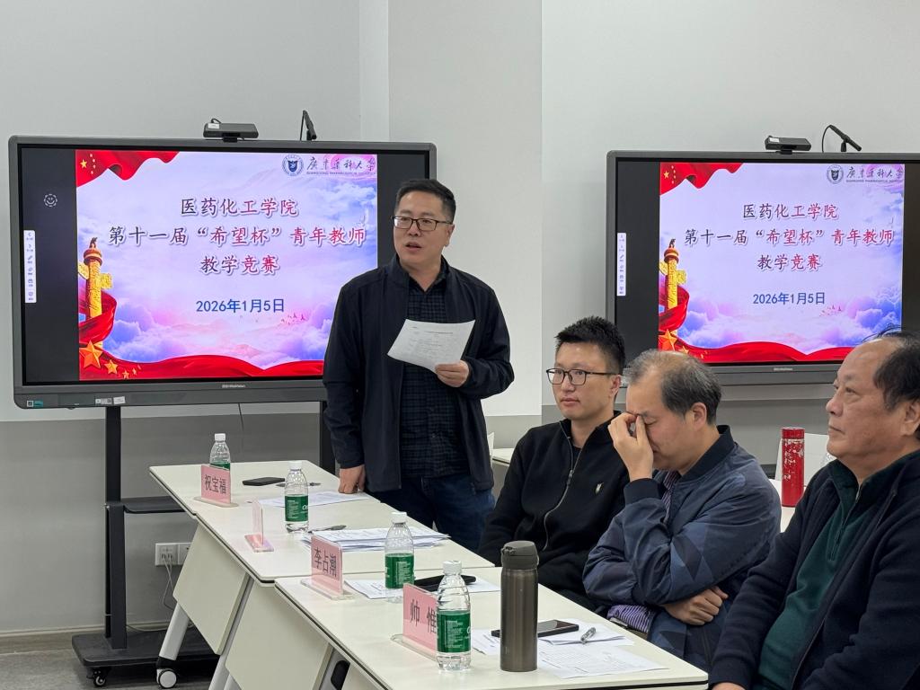 2026年1月5日下午,医药化工学院2025-2026学年青年教师教学竞赛在智慧教室4-105顺利举行。本次竞赛汇聚了学院7名优秀青年教师同台竞技,学院特邀学校教学督导组成员帅惟教授、院级教学督导组专家以及教师代表组成评审委员会。全院教职工及各专业学生代表到场观摩,现场气氛庄重而热烈。